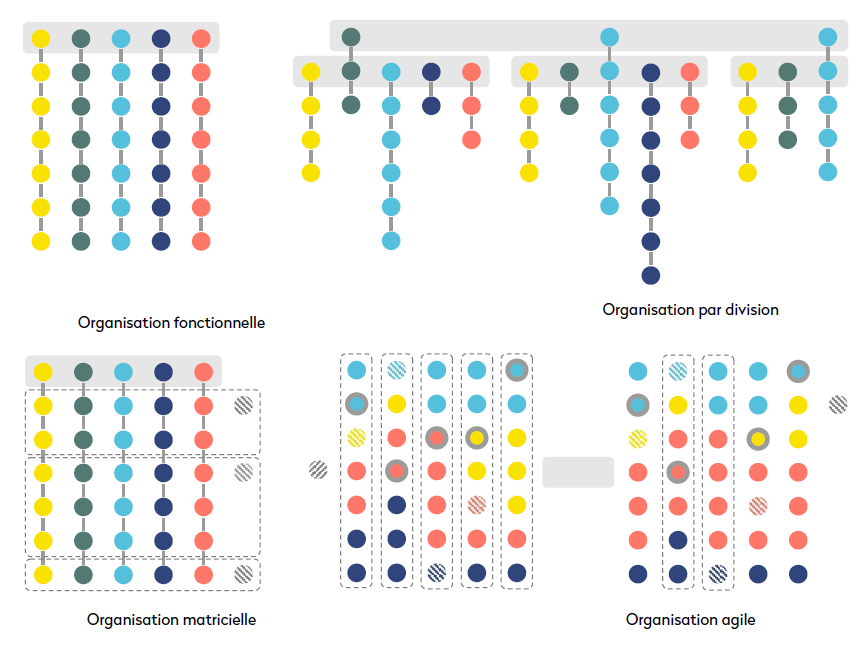 Certaines entreprises ont mis en place une organisation matricielle cherchant à mixer les deux précédentes. Un collaborateur aura alors deux référents : un fonctionnel, avec lequel il va travailler les sujets d’expertise métier et un référent de division, avec qui il va axer ses efforts sur le développement de projets transverses. S’il évite silos et chevauchements, ce type d’organisation est réputé générer une certaine complexité. Pour le collaborateur, elle nécessite d’équilibrer sa relation avec deux référents n’ayant pas toujours la même nature de pouvoir. L’organisation matricielle impose ainsi une communication renforcée pour échanger sur des objectifs différents et aligner les différentes parties prenantes sur les moyens à allouer pour y parvenir.
