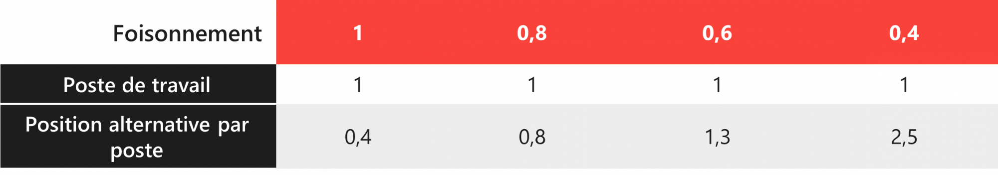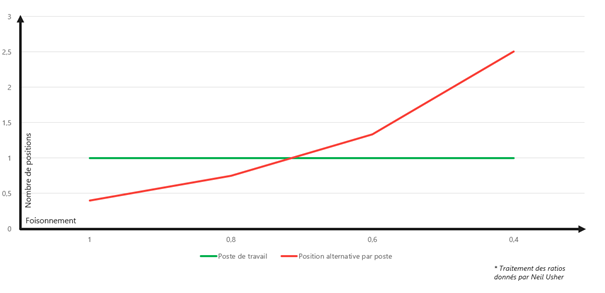 Ainsi, afficher un foisonnement de 30 : 100 indique que seulement une partie des inscrits pourront se rendre sur site en simultané. Le foisonnement effectif pour les occupants à moment T cela lui supérieur, supérieur à 55 : 100 dans la majorité des cas. Les études de benchmark et de projection des usages permettent de faire des projections tendancielles pour déterminer les différentes positions de travail à implanter selon le foisonnement retenu. Il est communément admis que plus les postes sont partagés, plus il faut de positions alternatives. Le consultant anglais Neel Usher considère que, quel que soit le cas de figure, il faut prévoir 1,4 positions par personne : s’il y a un poste par collaborateur, il faut prévoir 0,4 positions en salles de réunions et en alternatives ; s’il y a 0,7 poste par collaborateur, c’est 0,7. Dans son guide son l’Activity Based Working, Juriann Van Meel donne des ratios légèrement différents mais reprenant la même logique.