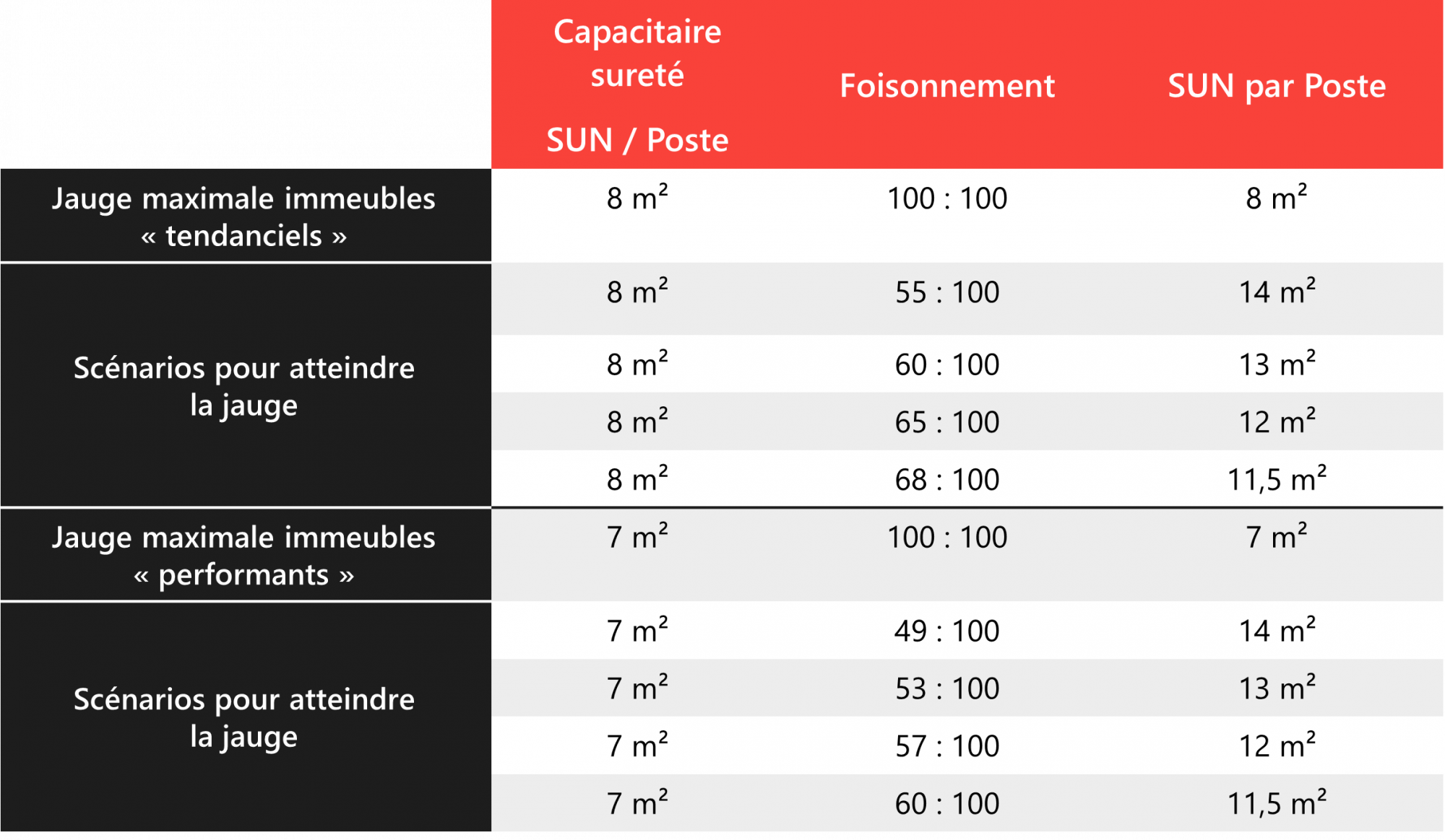 Le tableau ci-dessous donne des points de repères sur les foisonnements maximums et surfaces par poste associés à partir desquels il est probable que la jauge soit dépassée. Deux cas de figures sont présentés : des immeubles dits « tendanciels », qui correspondent à la plupart des immeubles étudiés pour faire cette simulation et des immeubles « performants », qui sont souvent des réalisations récentes destinées à être commercialisées en multi preneurs et avec des surfaces divisibles relativement petites (inférieures à 1000 m²). Pour les premiers immeubles, le capacitaire sécurité est fréquemment dimensionné à environ 8m² par personne sur site. Pour les seconds, il est autour de 7m². Avant d’aller plus en avant, il est intéressant de noter les capacitaires sont surdimensionnés pour des aménagements en attribué ou en partage de poste tels qu’ils se faisaient pré-crise, jusque dans les scénarios les plus innovants (foisonnement proche de 65 : 100). A chaque foisonnement est indiqué une surface par poste. Plus le foisonnement est important, plus la surface par poste augmente : le nombre de postes de travail évolue inversement au nombre de positions collaboratives. Dans ces scénarios, la notion de poste de travail est une donnée d’entrée, ce qui compte c’est le nombre de collaborateurs associés. Ainsi, tous ces scénarios partent du principe d’un même nombre de collaborateurs sur site en simultané – ce nombre étant fixé par le capacitaire de sécurité.