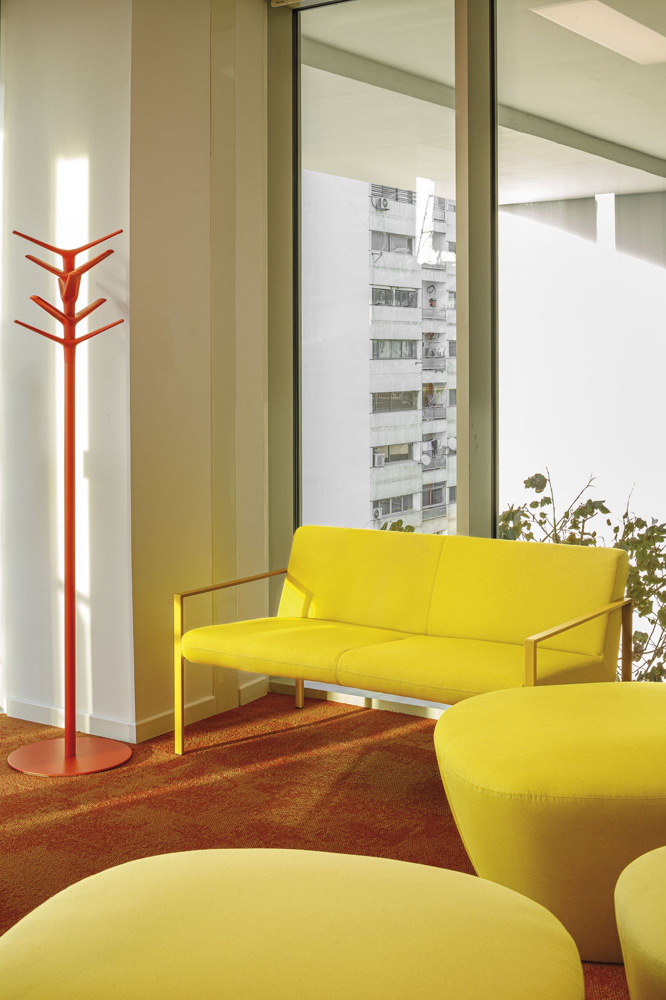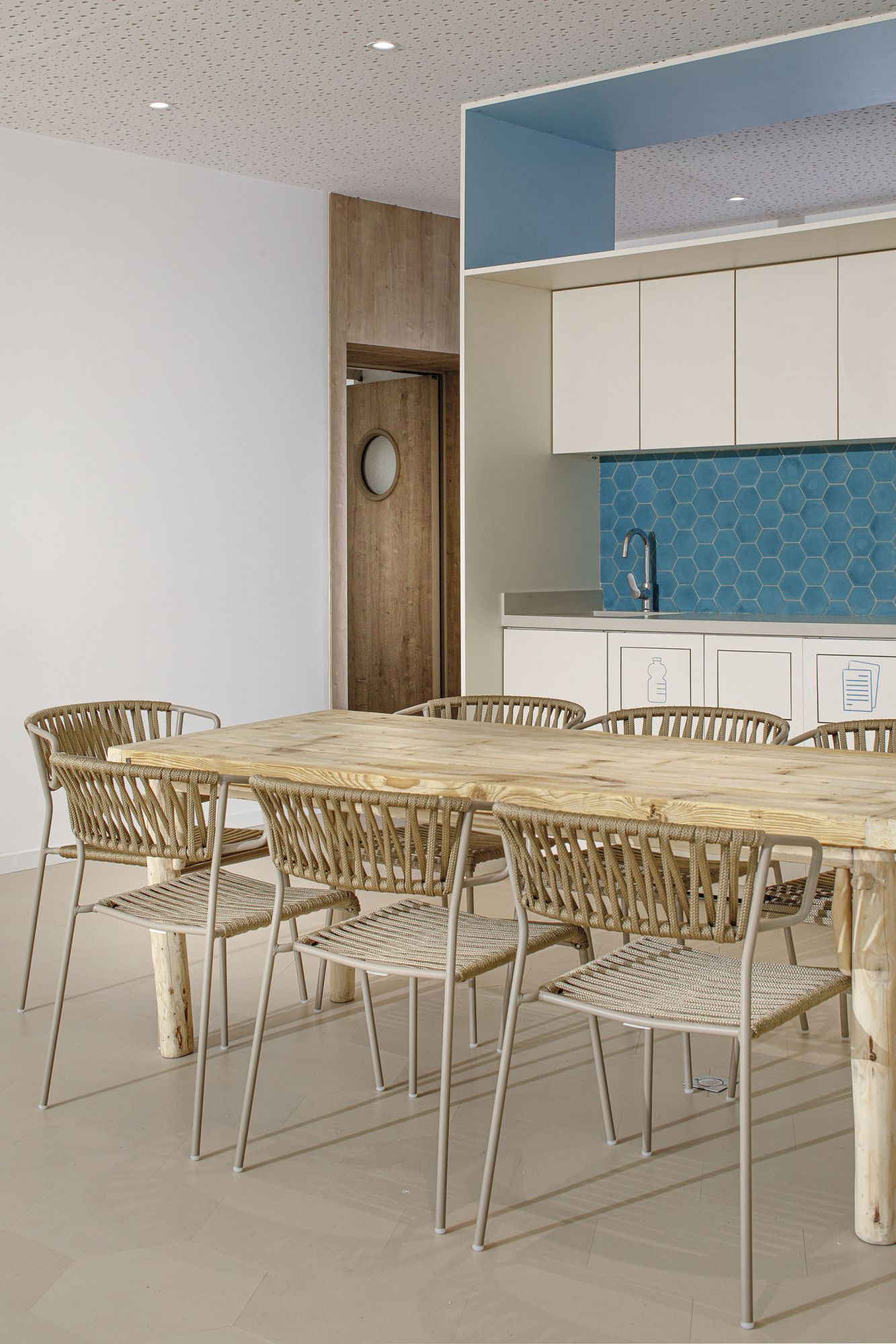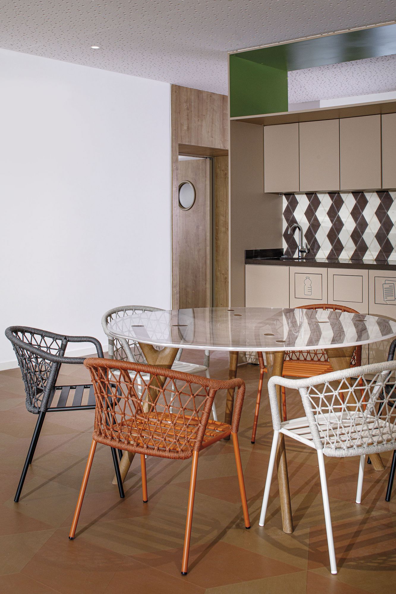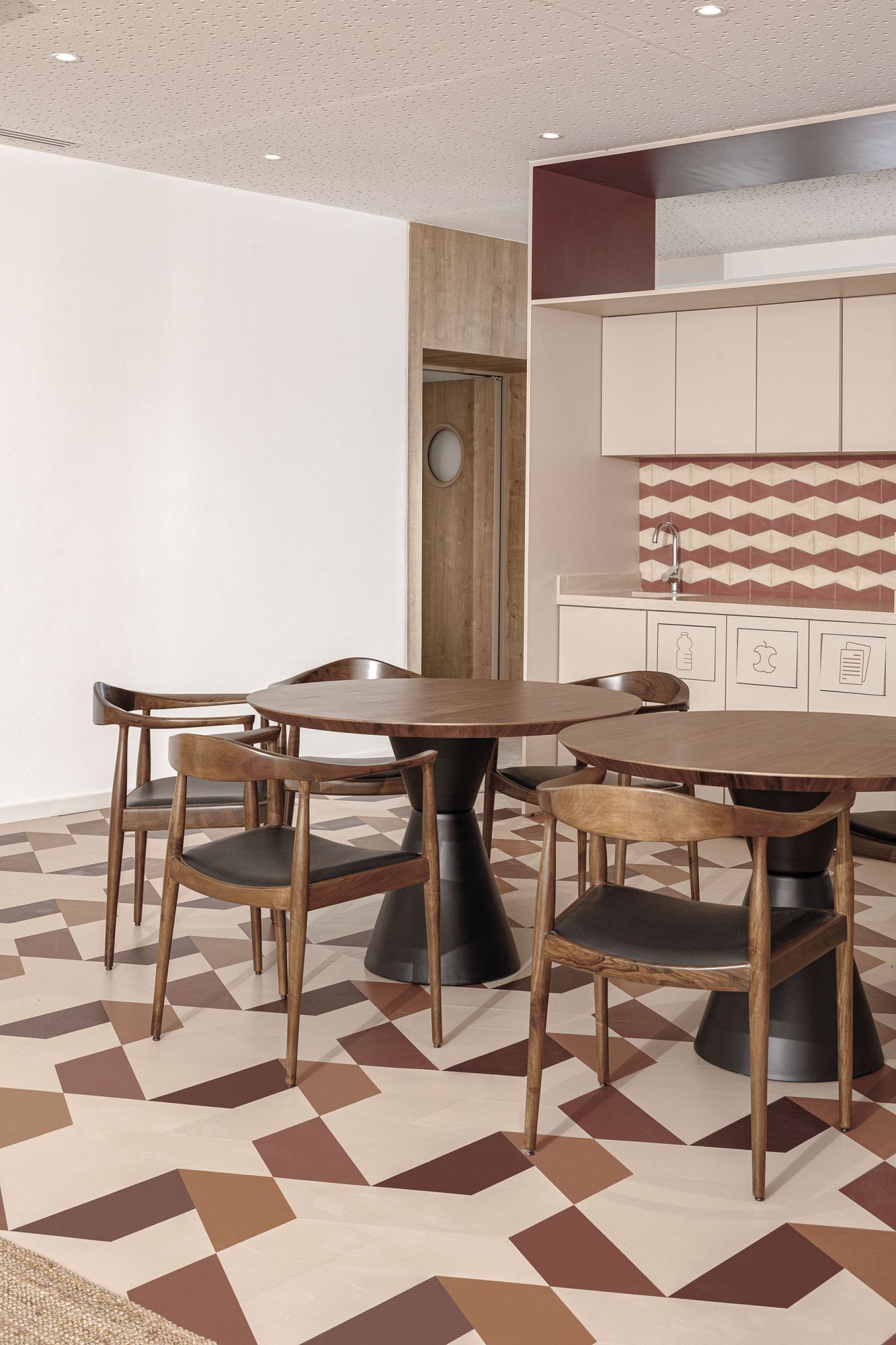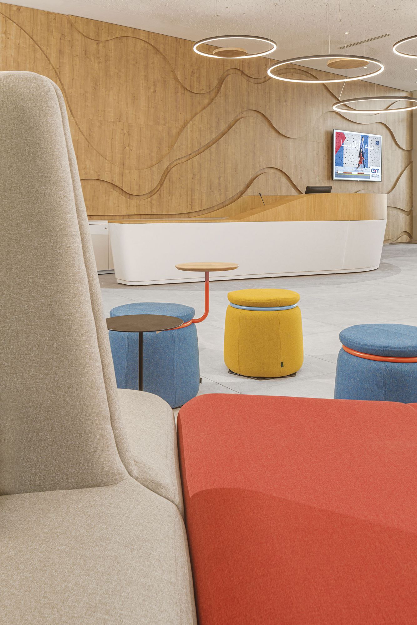 Le lounge d’étage est un espace central où se croisent plusieurs flux collaborateurs, avec un design personnalisé pour marquer l’étage, avec comme thématique « Paysage et artisanat marocain »