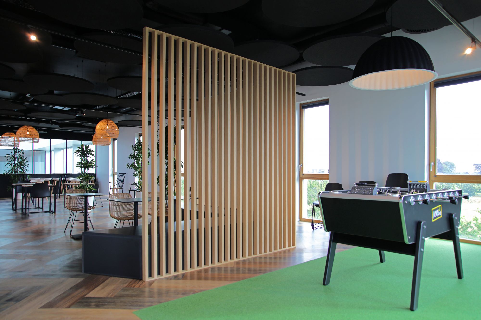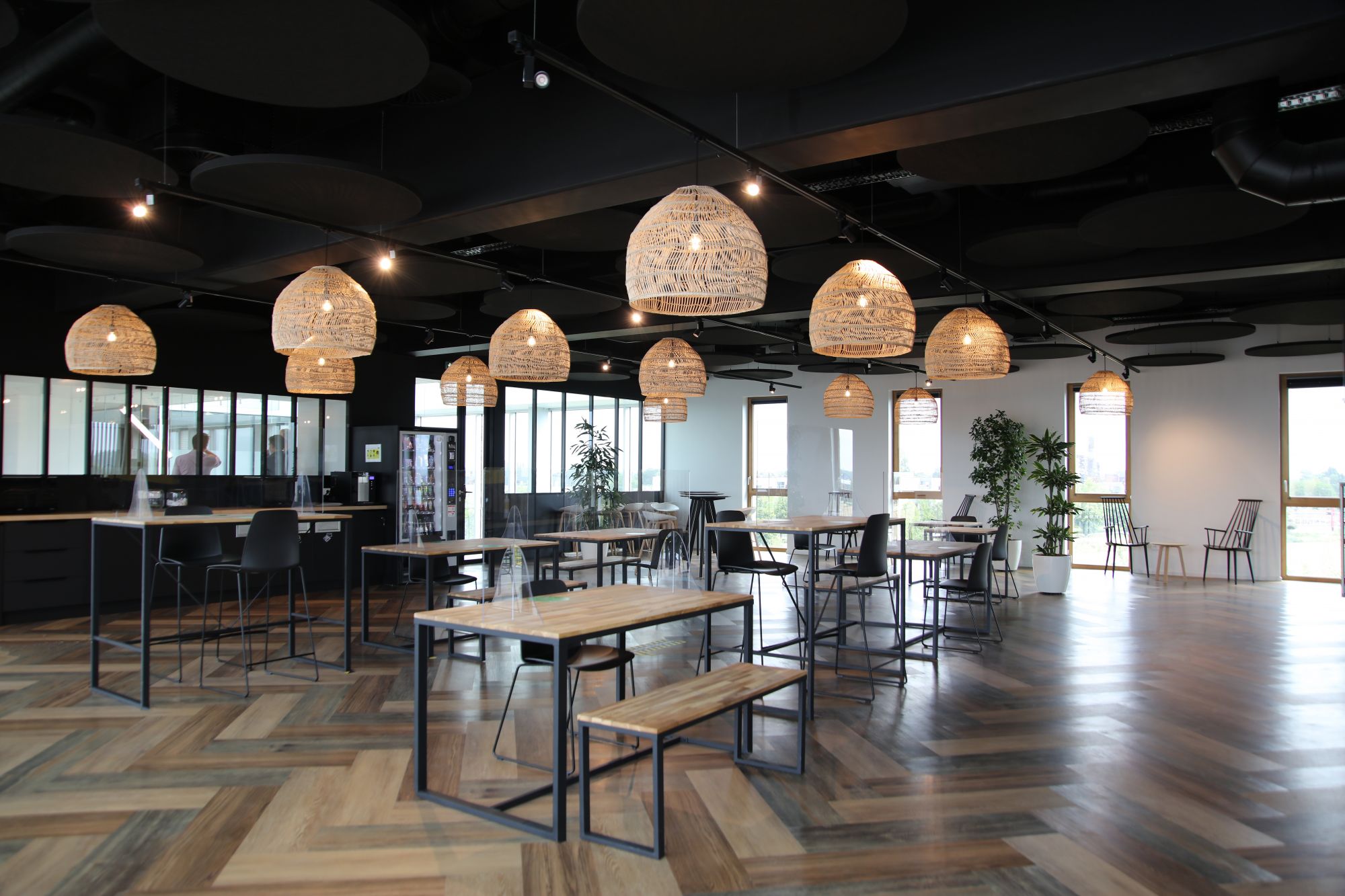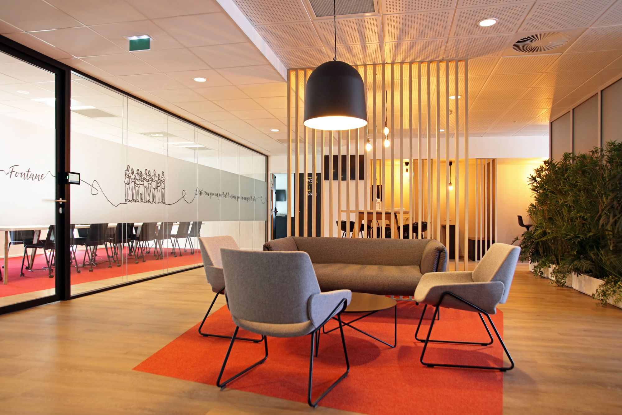 Les ambiances ont été réalisées en co-création avec les équipes de McCain qui souhaitaient un lieu imprégné de la culture d’entreprise, avec une prépondérance de bois et végétal, et un calepinage du sol assez marqué pour différencier les typologies d’espaces.