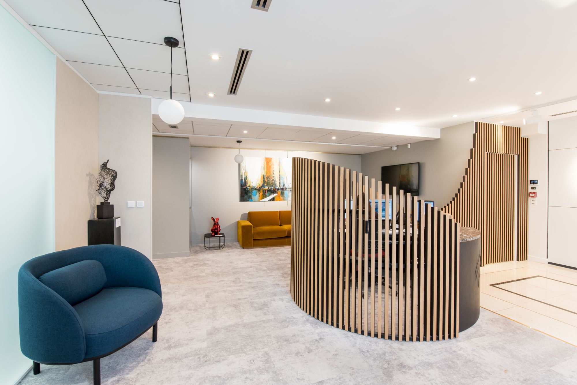 • Intégration des enjeux de confort visuel et acoustique dans la conception des aménagements (confidentialité des salons clients, confort des salons de réception)
