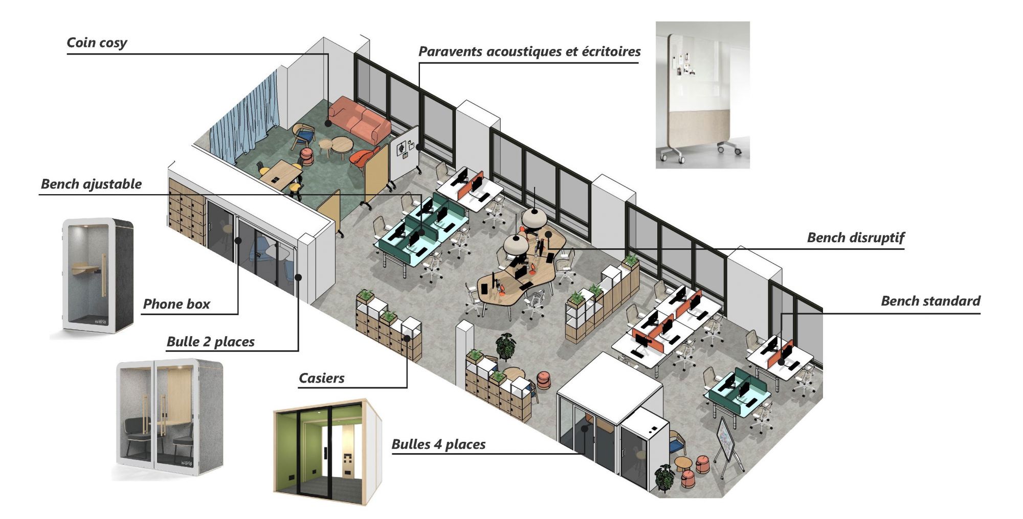 Transitant d’un univers à l’autre, le projet propose une variété d’espaces hybrides tantôt plus « technologiques » tantôt plus « humains », qui font le lien entre les deux ambiances.